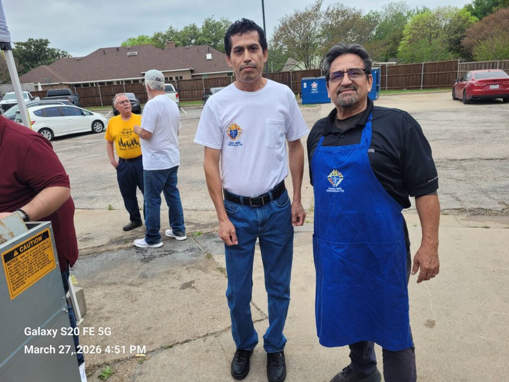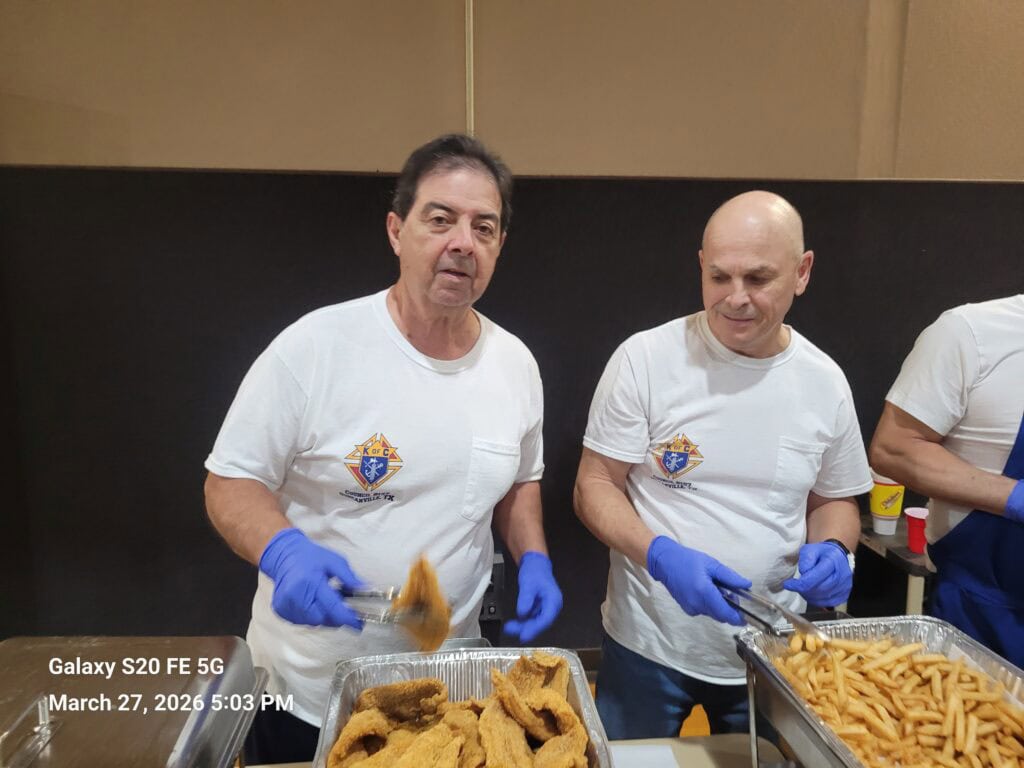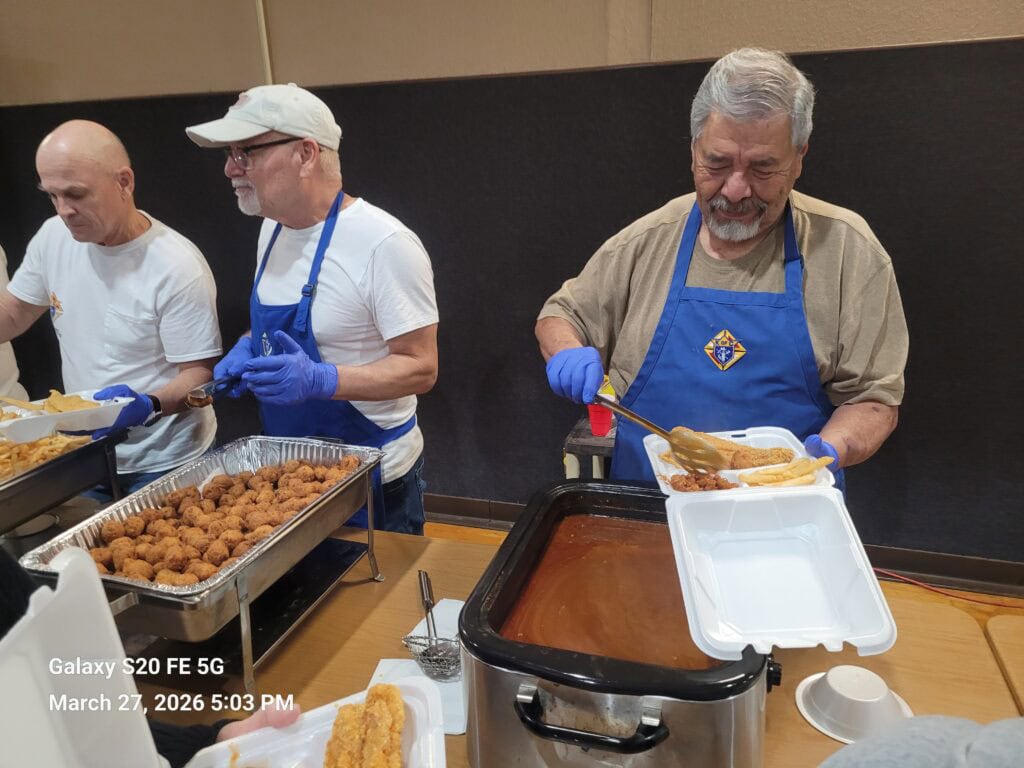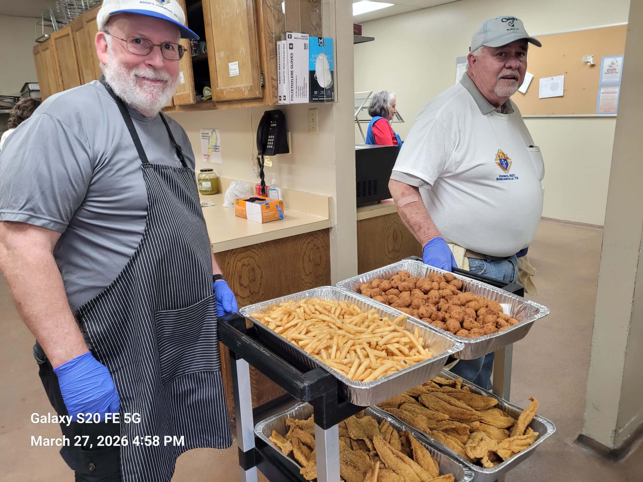 Forty Knights and assistants worked at the final fish fry of the 2026 Lenten season this past Friday afternoon/evening. It was suggested to me that the large number of people working was because it was the final fish fry of the year. Whatever the reason, it was certainly a pleasure to see so many Knights and others work together to provide a memorable experience for the many guests who partook of an excellent meal. Those Knights in attendance were: Doug Karpan, Jorge Ruiz, Jesus Medina, Cesar Villarreal, Drew Carlson, Juan Espinoza, Dan Murphy, Mike Clark, Jorge Caraveo, Joe Simecek, Joel Lopez, James Smith Mike Fitzgerald, Jeff Traub, Larry Balagna, John Owen, Peter Perta, Russell LeRoy, Gerardo Lopez, David Ybarra, Joe Hernandez, Ray Rivera, Hector Lopez, Rolando Sobalvarro, Gamaliel Hernandez, Greg Warr, Hector Lopez, Joe Eubank, Russell Gully, Adan Luna, Lupe Hernandez, Alex Carlson, and Tony Gonzalez, These Knights were assisted by: Holly Patterson, Cappie Wood, Izzy Via, Norma Luna, Max Luna, Madison Reesing, and Mayra Hernandez. (Please forgive me if I missed anyone). As always the atmosphere was both exciting and efficient. An out-of-towner commented to me that “this is quite an operation”. And indeed it was a wonderful experience whether you were helping with the cooking/serving or enjoying the dining experience. Thanks to all who took part in this Lenten tradition and may your Easter be blessed.
