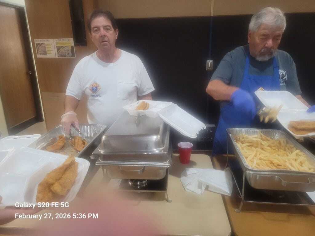 Even more people ate at the fish fry this past Friday February 27, 2036 – 247 in total. There were a few less Knights working this particular Friday but with the help of Holly Paterson, Connie Caraveo, Issy Via and Norma Luna, everything went smoothly. Once again there was a great deal of merriment in the gymnasium. The Knights who worked this past Friday were, for the most part, the same Knights who worked the previous Friday. Perhaps we’ll see some new faces at the next fish fry – what say you? There isn’t a lot new to report on during this fish fry; everyone seems to have found their niche and operated smoothly. The line moved along at a good pace thanks to the Knights frying fish and French fries and hush puppies – we never ran out of any food. Same was true for salads and coleslaw; never ran out of drinks either. Tradition I list the names of the Knights who helped make the event a success, so I’ll do the same again. The following Knights, in no particular order, put in the time either preparing the gymnasium, or cooking, or keeping the kitchen organized, or making salad and coleslaw or working on the serving line, or keeping up with the drinks, or chopping up the fish and making tacos out of them, Thank you: Jorge Caraveo, Dan Murphy, Jeff Traub, Cesar Villareal, Mike Fitzgerald, Arthur Rodrigues, Doug Karpan, Mike Clark, John Owen, Joe Eubank, Frank Salazar, Ray Rivera, Larry Balagna, Jorge Ruiz, Steve Reid, Antonio Rodriguez, Greg Warr, Hector Lopez, Peter Perta, Adan Luna, Gonzalo Aillon, Russell Gully, Drew Carlson, Gerardo Terron, Alex Carlson, Allen Reitmeier. My apologies to anyone I may have missed and thanks to all who made fish fry #2 a success. See you next Friday.