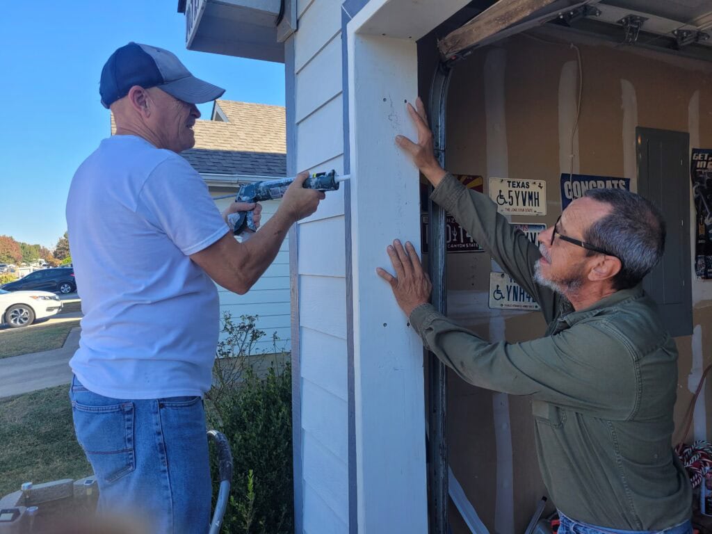 I thought we might have been just a bit “over our heads” regarding the latest Knight Hands project. But Juan Torres, Jose Montoya, Hector Rubio and Phil Holifield quickly erased all my reservations. The job required us to replace all the wood framing and trim around the entire garage door and completely replace the rear door. Juan and Jose seemed to know exactly how to replace the rear door and did so in a relatively short period of time with no mishaps. Not only that, but the fit is absolutely perfect. The door closes with a light push and a snug fit. They also replaced the trim on the outside and inside of the door and added a water barrier at the top of the door to prevent future water damage. They did all this before noon. Shirley Joe was most pleased. Shirley is the widow of former Knight, Wilton Joe. You should know that this project was brought about by Jose Montoya, who as Family Director, had made contact with Shirley and reminded her that the Knight of Columbus are here to help widows and orphans.