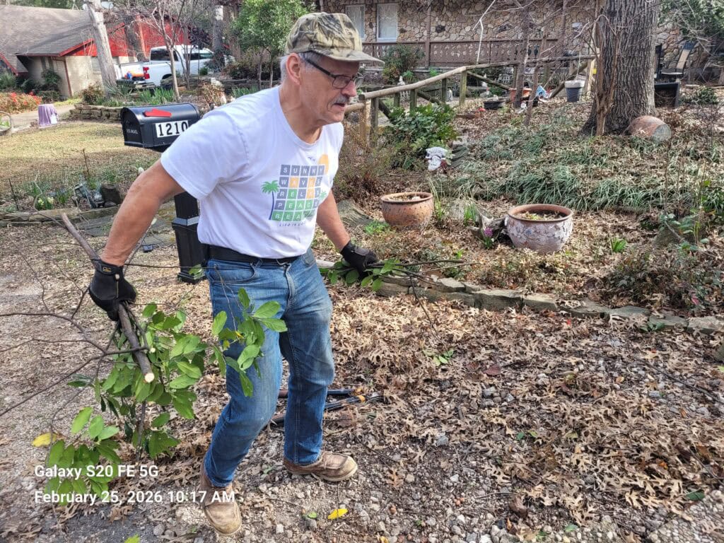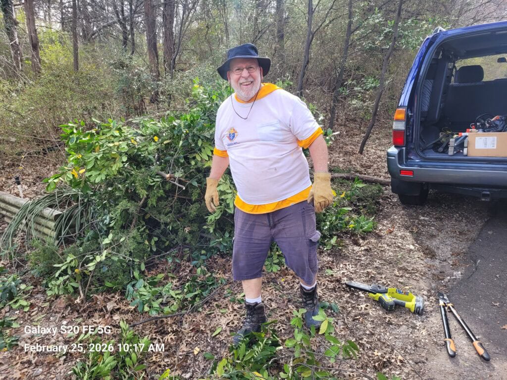 A special “thank” you to Mike Fitzgerald and Joe Eubank for taking time out of their busy schedule to trim two trees for Gabi Hardin on the morning of February 25th. While we were there we also cut out a nasty bush and moved a rock upon Gabi’s request. There was nothing special about this job, except that the tree branches were quite high and so it was vital that Joe brought along his pole saw which extended at least 16 feet. Joe Eubank did most of the cutting while Mike Fitzgerald and I cut up the fallen branches and placed them for pick up by Republic. Once finished here, we all moved onto the property of Julie Kutil where again we trimmed a tree. This was a bit more difficult because the branch was quite large and hanging over the roof of Julie’s home. Joe and Mike were both on the roof cutting this branch into small segments which we then loaded into a truck and unloaded at the KofC grill on the church grounds. The small branches we piled at the curb for pick u later. It was very special to be able to help these two ladies and they were both most grateful. Well done, men