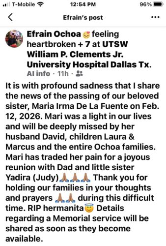 BrotherKnights, Efrain wanted to let you know that his loving sister Irma De La Fuente passed away peacefully yesterday afternoon. She is in eternal peace, freedom from pain and resting safely in Gods care and the hope of reunion. 🙏🏽🙏🏽🙏🏽